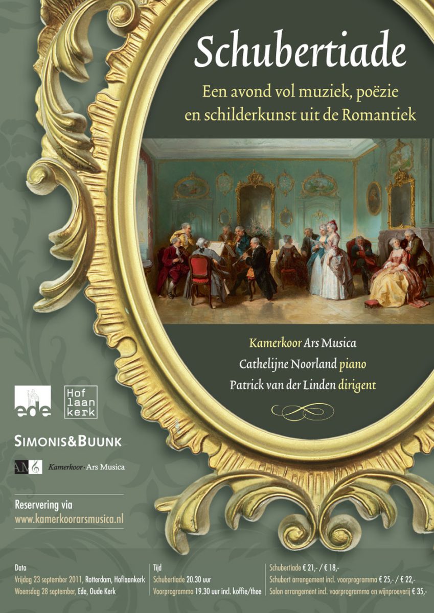 In de Romantiek is men er dol op. Salons à drie vormen van kunst. Muziek, poëzie, schilderkunst. Samen zijn ze mooier, nóg mooier, dan elk voor zich. Die tijden herleven. Kamerkoor Ars Musica zingt Schubert, Schumann, Brahms. Patrick van der Linden dirigeert – Cathelijne Noorland speelt gloedvol piano. Wij zijn er met onze nieuwste aanwinst: ‘De muziekavond’ van de Haagse Romanticus Ten Kate. En met keur aan andere composities. Op doek. Hoorbaar wordt zichtbaar. Hóór: daar wandelt Goethe. ‘Boven alle heuveltoppen is het stil… De vogels zwijgen in het bos’. Schubertiade. Romantiek ten top.