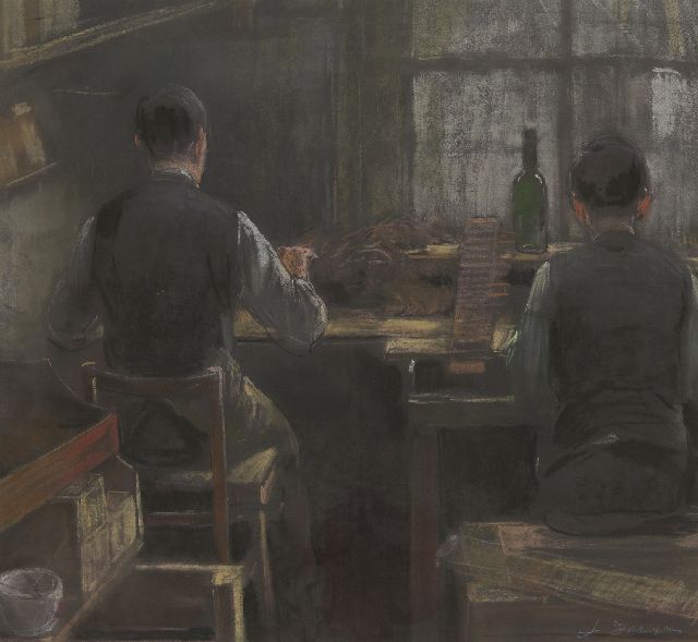 De biljartzaal van café Le Lievekenshoek in Brussel, olieverf op doek 80,5 x 100,7 cm, gesigneerd l.o. en verso