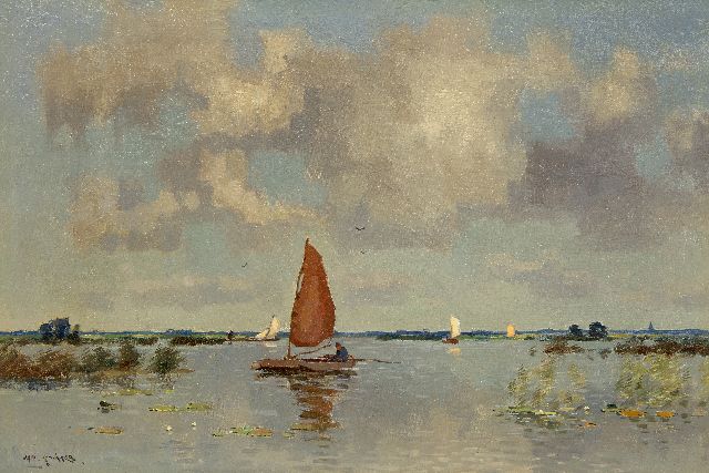 Plaslandschap met visser, olieverf op doek 30,7 x 50,2 cm, gesigneerd l.o.