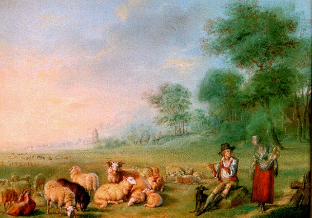 Herder, herderin en kudde schapen, pastel op papier 18,8 x 25,0 cm, gesigneerd r.o.