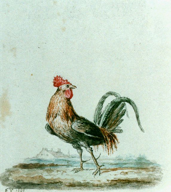 Haantje, aquarel op papier 6,5 x 6,0 cm, gesigneerd l.o. monogram en gedateerd 1828