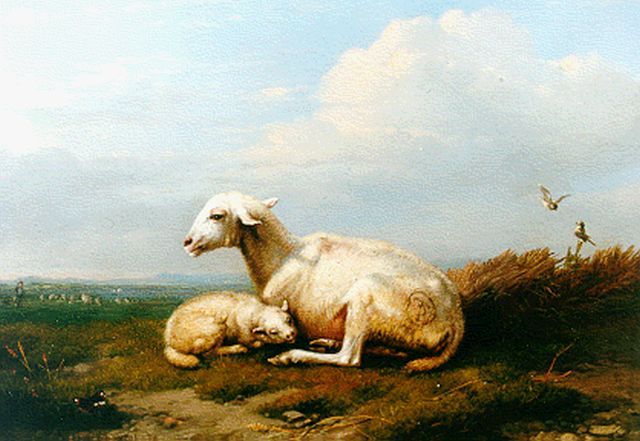 Verboeckhoven E.J.  | Schaap met lam en vlindertje in pastoraal landschap, olieverf op paneel 12,1 x 15,2 cm, gesigneerd l.o. en gedateerd 1845 Verboeckhoven E.J.
