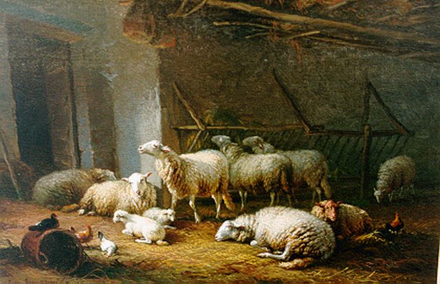 Pluimvee en schapen in een stal, olieverf op doek 32,5 x 48,2 cm, gesigneerd l.o. en gedateerd 1860