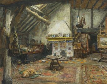 Het atelier van de schilder Frans Langeveld, olieverf op papier op paneel 35,2 x 43,7 cm, gesigneerd r.o.