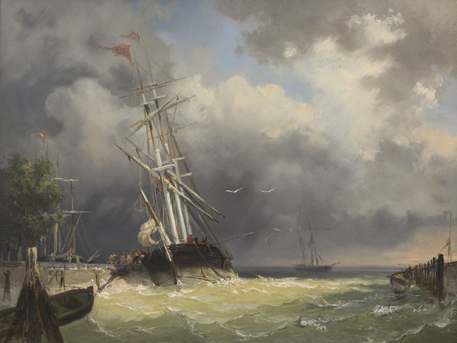 Binnenvarende driemaster bij storm