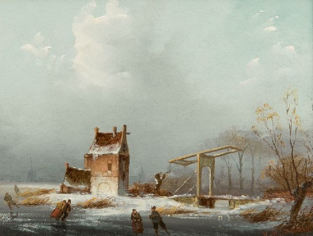 IJsgezicht met schaatsers bij houtzaagmolens, olieverf op paneel 40,5 x 62,9 cm, gesigneerd l.o.