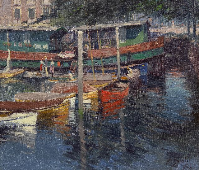 Vissers bij zonsondergang, olieverf op paneel 24,2 x 19,0 cm, gesigneerd l.o.