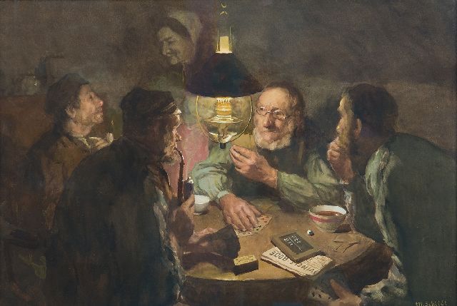 De schaakpartij (niet te koop), gouache op papier 26,5 x 20,0 cm, gesigneerd r.v.h.m.