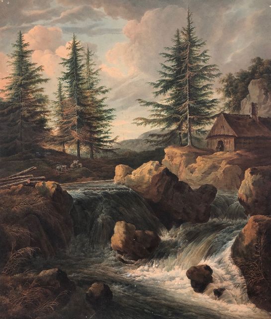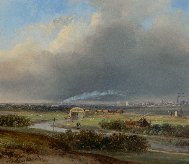 Herdersjongen met koeien en stier, een stad in de verte, olieverf op paneel41,5 x 64,5 cm, gesigneerd r.o. en te dateren ca. 1825-1835