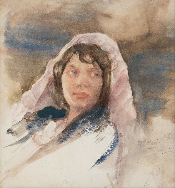 Portet van een staande dame met hoofddoek, inkt op papier 22,8 x 17,7 cm, gesigneerd met initialen en gedateerd 1936