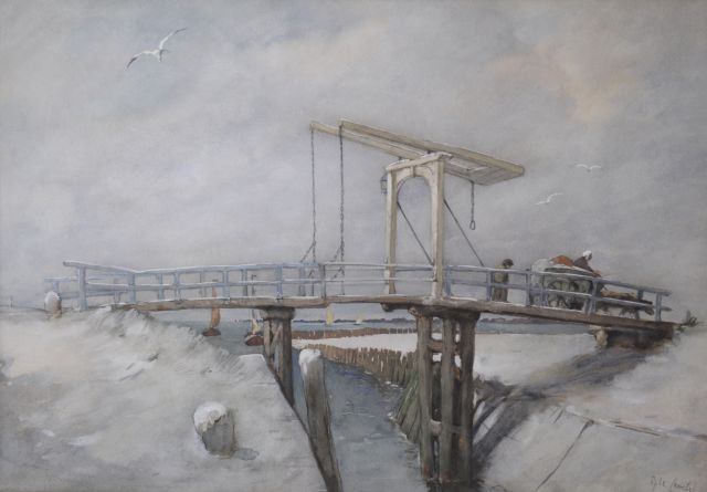 Adolf le Comte | Winterse ophaalbrug met kar en figuren, aquarel op papier, 45,5 x 64,6 cm, gesigneerd r.o.