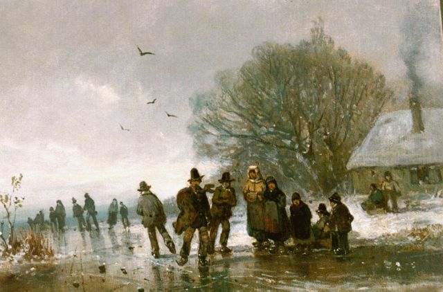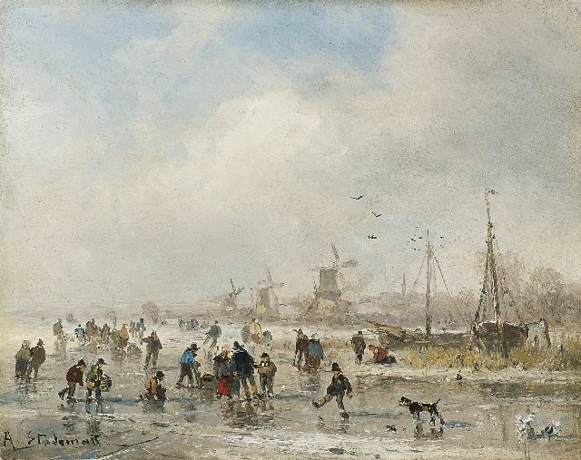 Adolf Stademann | IJspret op bevroren waterpartij, olieverf op doek op paneel, 33,5 x 46,2 cm, gesigneerd l.o.