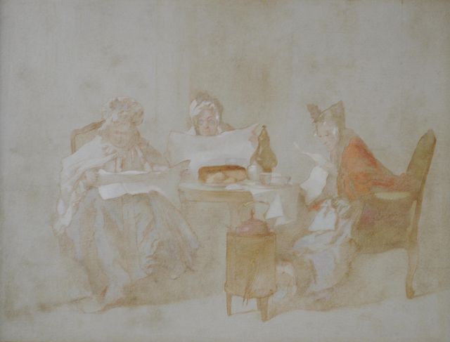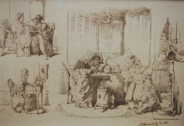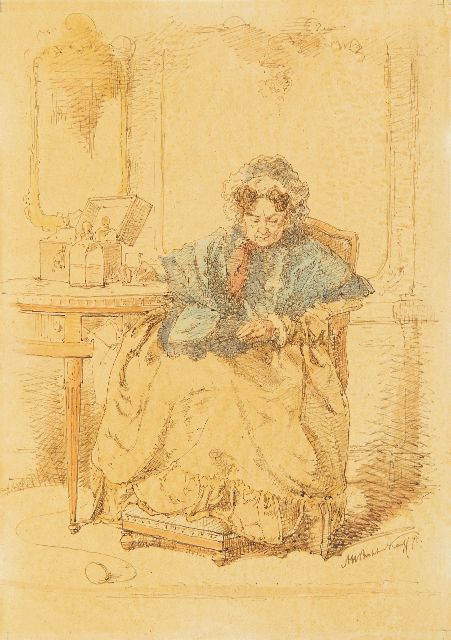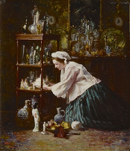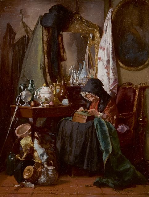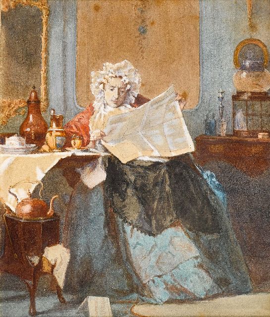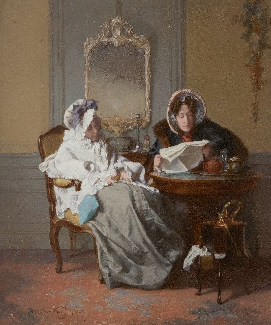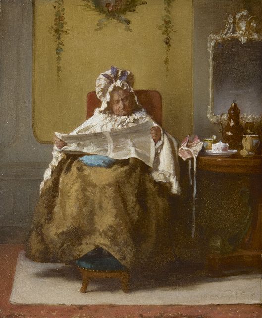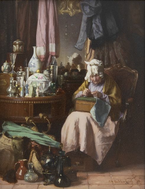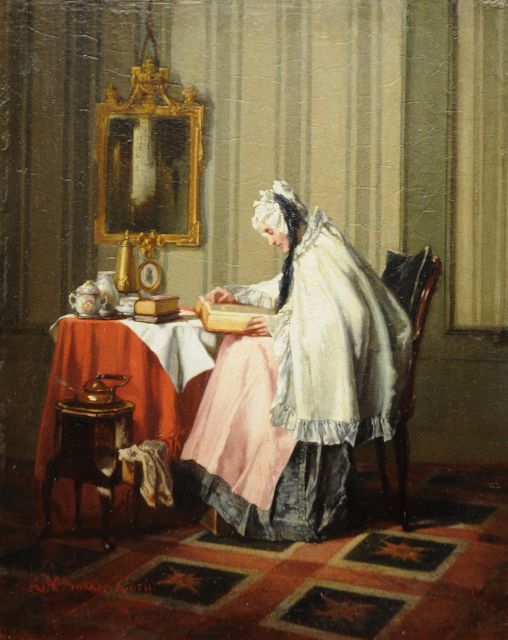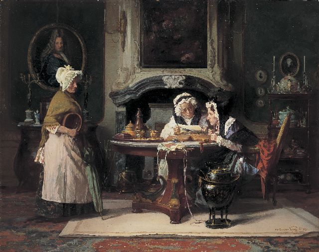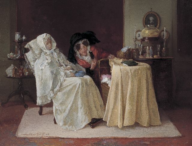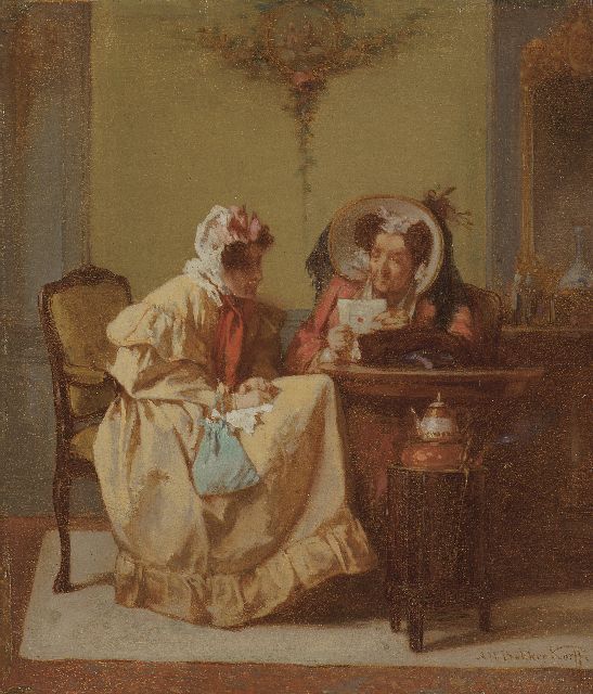 Alexander Hugo Bakker Korff werd in 1824 in Den Haag geboren en volgde vanaf 1844 les aan de Academie van Den Haag en Antwerpen, waarna hij zich in 1856 in Leiden vestigde. Aanvankelijk schilderde hij Bijbelse en mythologische voorstellingen in een romantisch-classicistische stijl, maar in 1859 stapte hij over op een ander genre. Hij verlaat het historische genre, breekt met de academische conventies en bekwaamt zich in het uitbeelden van intieme tafereeltjes in de sfeer van Hildebrands Camera Obscura. In een uiterst precieze stijl schildert hij kleine, huiselijke tafereeltjes waarin het onderwerp de ‘menselijke komedie’ is. Hiervoor zaten zijn deftige, ongetrouwde zusters, met wie hij samenwoonde, model. Meestal waren de dames gekleed in 18e-eeuwse kleding, waarvan Bakker Korff een hele verzameling had in zijn atelier. Omringd door allerlei bric-à-brac in een overvol interieur, voerde hij hun leventje en vaste gewoonten ten tonele. Altijd met humor en lichte ironie, die hij vatte in geestige titels als ‘De tantes gaan op reis’, ‘Een kop bouillon en een glas port’ of ‘La politique au déjeuner’. Niet alleen vanwege de technisch verfijnde stijl maar zeker ook vanwege de ironie werd het werk van de schilder snel zeer populair en menig ‘Bakker Korffje’ vond zijn weg naar kunstkopend publiek in binnen- en buitenland.