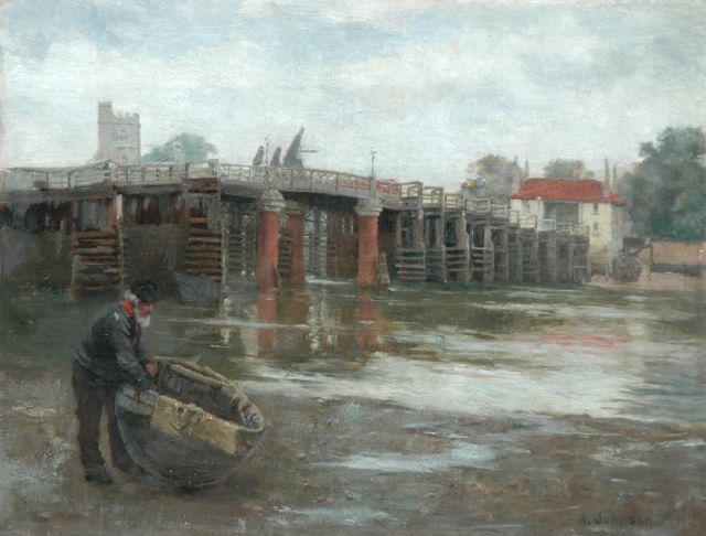 Alfred Johnson | De oude brug, Putney, olieverf op doek op paneel, 26,4 x 34,3 cm, gesigneerd r.o.