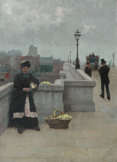 Alfred Johnson | Bloemenverkoopster op Putney Bridge, Londen, olieverf op doek, 45,7 x 33,1 cm, gesigneerd r.o. en gedateerd 1887