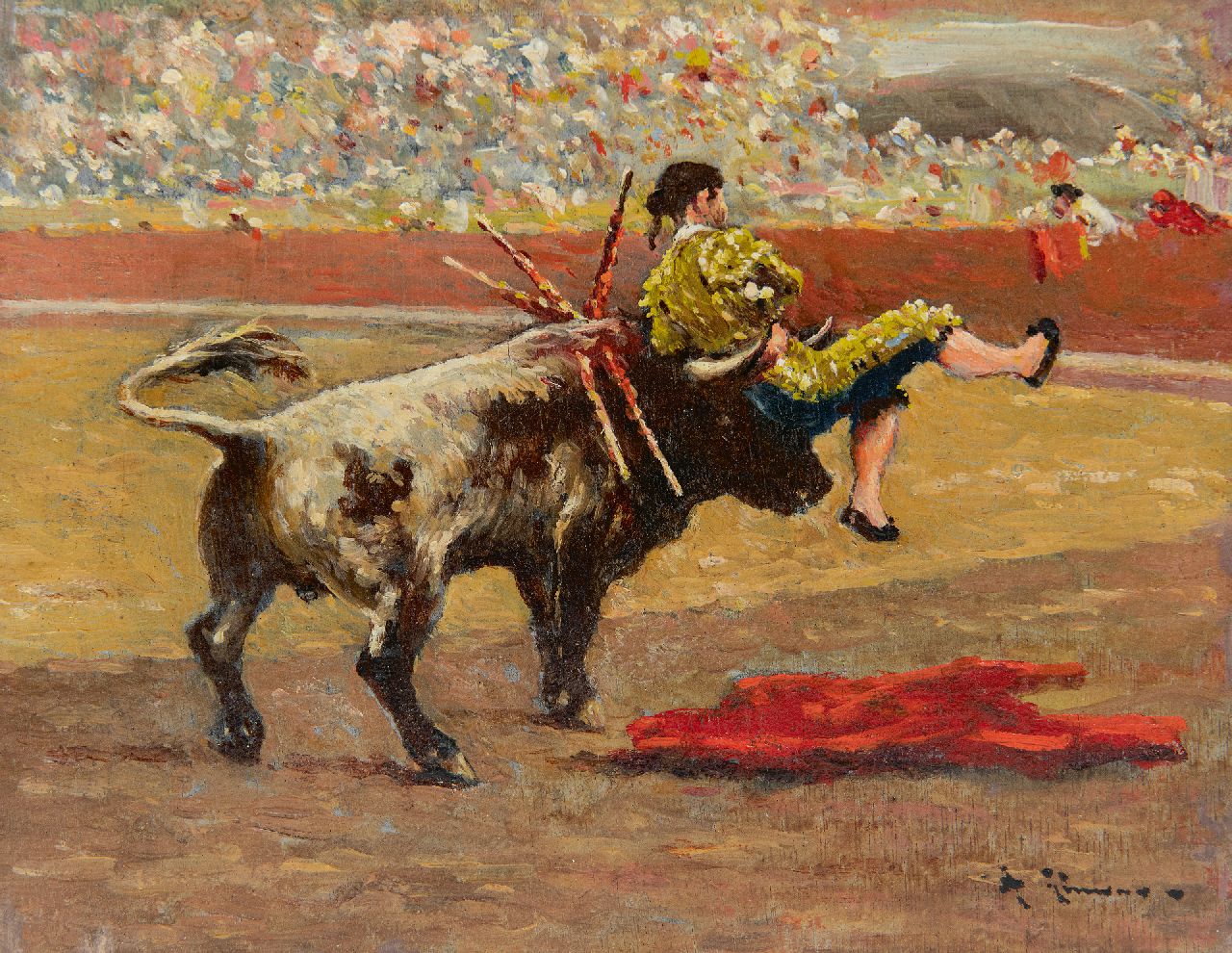 Andrés Gimeno | Het Stierengevecht, olieverf op paneel, 14,2 x 18,1 cm, gesigneerd r.o.