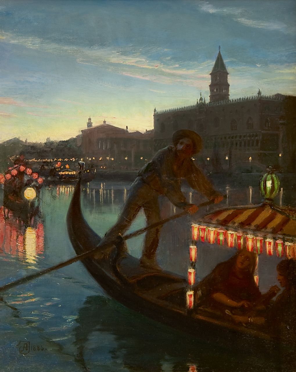 De realistische Deense schilder August Jerndorff werd geboren in het Duitse Oldenburg, waar zijn vader hofschilder was. Hij studeerde aan de gezaghebbende Royal Danish Academy of Fine Arts (1863-1868) en was ook leerling van de Deense landschapschilder P.C. Skovgaard. Met een studiebeurs van de academie trok hij in 1875 naar Italië, waar hij drie jaar bleef en onder andere stadsgezichten schilderde. In 1880 was Jerndorff medeoprichter van een alternatieve kunstacademie in Kopenhagen, de voorloper van ‘Kunstnernes Frie Studieskoler’ (1882), een school die werd opgericht als reactie op de verouderde artistieke opvattingen van de academie en een belangrijke rol zou spelen in de doorbraak van de moderne kunst in Denemarken. August Jerndorff specialiseerde zich uiteindelijk in het schilderen van portretten.
