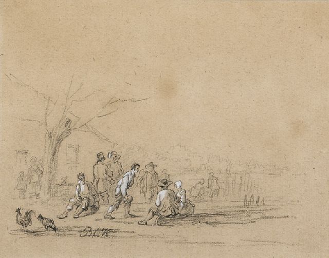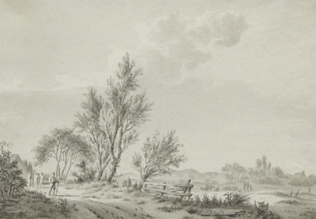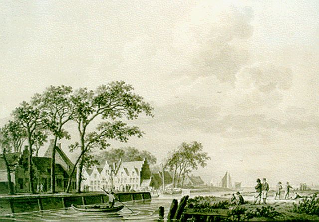 IJsgezicht met schaatsers en houtsprokkelaars met een paardenslee