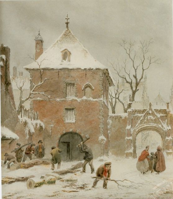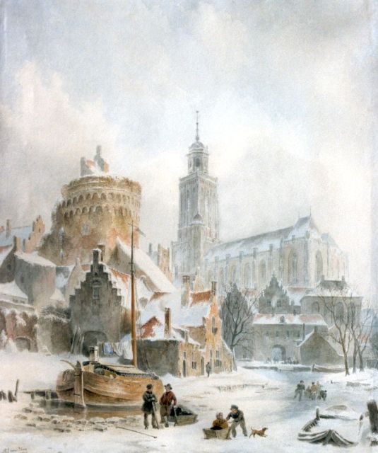 Winterse kade met stadspoort (pendant van Zomers stadsgezicht met scheepsverkeer en figuren)