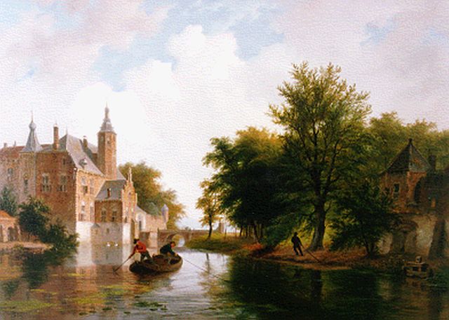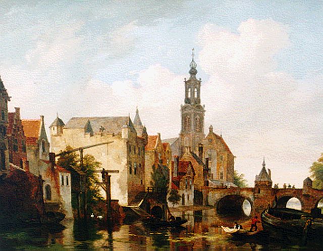 Zomers stadsgezicht met scheepsverkeer en figuren (pendant van Winterse kade met stadspoort; alleen tezamen)