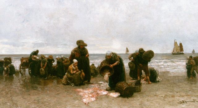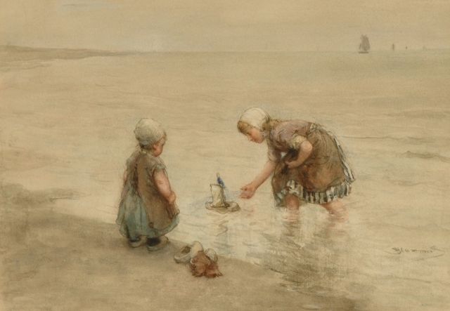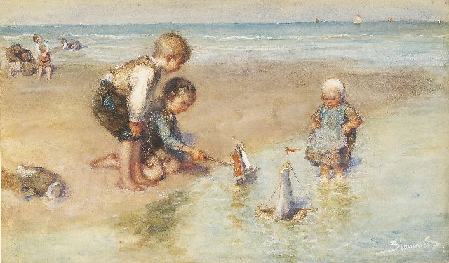 De twintig jaar oudere Israëls, die kort daarna een vriend voor het leven werd, was van grote invloed op het werk van Blommers. Beiden verbeeldden ze het eenvoudige leven van boeren en vissers in Katwijk aan Zee en Scheveningen. Maar waar Israëls doorgaans de barre levensomstandigheden van de vissersbevolking uitbeeldde, zag Blommers alles van de zonnige kant en benadrukte juist de gezelligheid van de donkere vissershuisjes. Als vader van een groot en levendig gezin schilderde hij het gelukkige familieleven. Zijn vroege werken, veelal zonnige strandtaferelen met badgasten waarvoor zijn kinderen in Scheveningse kostuumpjes model stonden, zijn tot in detail uitgewerkt, met een sterk gevoel voor kleur.