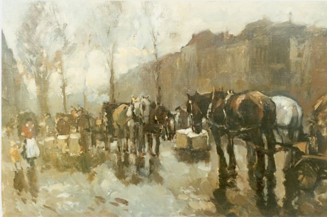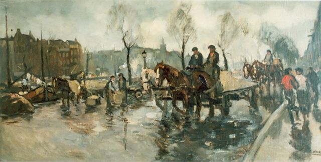 Cor Noltee | Paarden op drukke gracht, olieverf op doek, 50,0 x 100,0 cm, gesigneerd r.o.