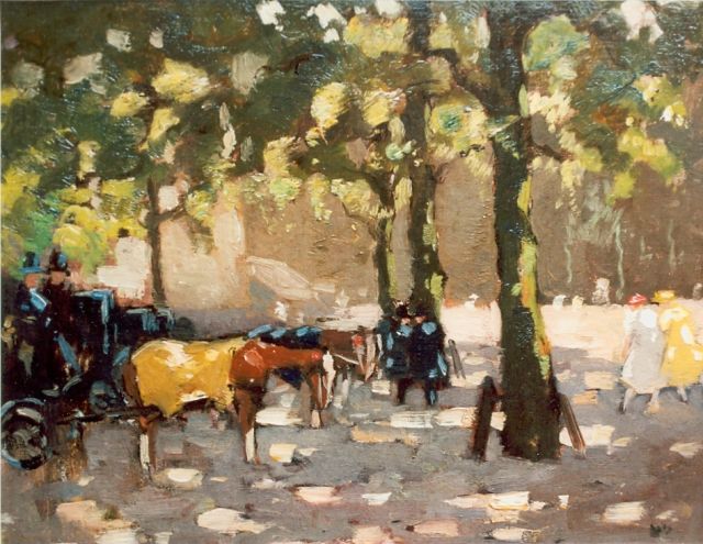 Cor Noltee | Gestationeerde rijtuigen in het park, olieverf op doek op paneel, 32,5 x 43,4 cm