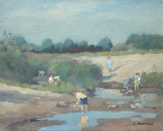 Cor Noltee | Spelende kinderen bij een vennetje, olieverf op doek, 24,4 x 30,2 cm, gesigneerd r.o.
