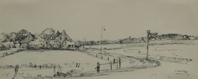 Cor Noltee | Landschap met boerderij, pen en inkt op papier, 12,4 x 30,1 cm, gesigneerd r.o.