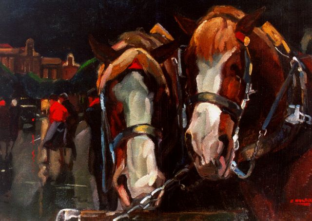Cor Noltee | Gestationeerde paarden in de stad, olieverf op doek, 50,5 x 70,0 cm, gesigneerd r.o.