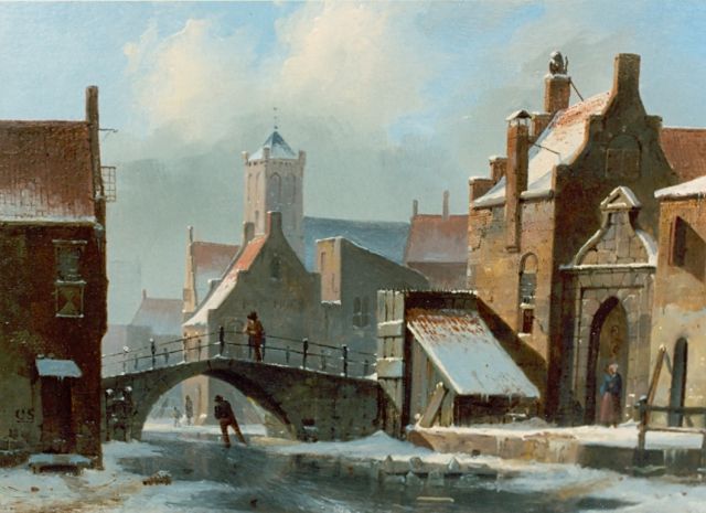 Cornelis Springer | Bevroren stadsgracht, olieverf op paneel, 17,2 x 23,2 cm, gesigneerd l.o. en gedateerd 1838