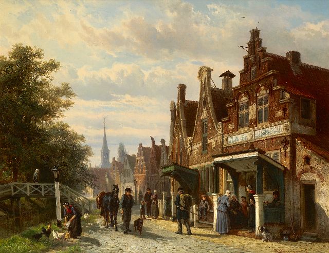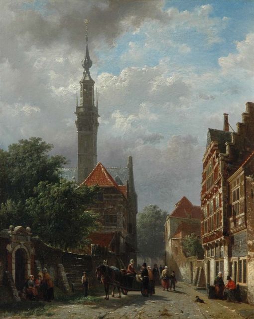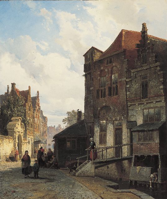 Cornelis Springer (1817-1891)schilderde vooral stads- en dorpsgezichten waarin gevels en levendige stoffage baden in een warm zonlicht. Samen met Barend Cornelis Koekkoek en Andreas Schelfhout behoort hij tot de belangrijkste schilders van de Hollandse romantiek. In zijn schilderijen is vaak een prominente plaats toebedeeld aan gebouwen uit de 17e en 18e eeuw. Soms is dit een fantasie-architectuur, maar in de meeste gevallen waren dit bestaande gebouwen waarvan men rond 1850 de schoonheid 'herontdekte'. Nadat Nederland in 1813 bevrijd was van de Franse onderdrukking kreeg het land behoefte aan identiteit en vaderlandse trots. De Gouden Eeuw, een periode van grote economische voorspoed en rijkdom, werd als voorbeeld genomen; Rembrandt werd verheven tot Hollands beroemdste schilder, Michiel de Ruyter werd nationale held. Het is dan ook niet verwonderlijk dat het oog van schilders zoals Cornelis Springer, afkomstig uit een geslacht van bouwkundigen, viel op de gebouwen die uit die glorietijd stamden.