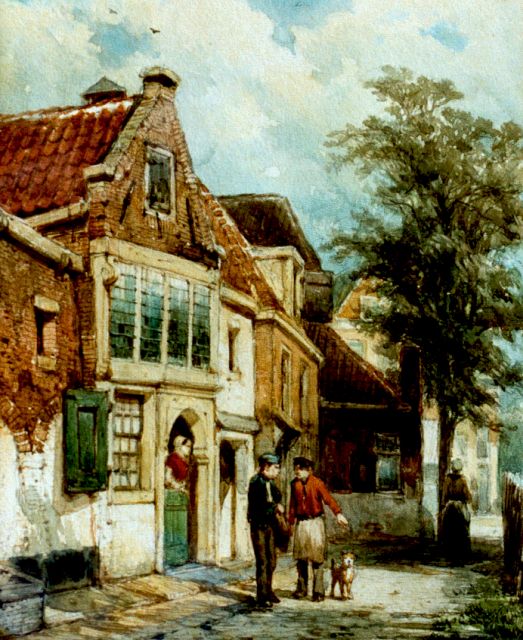 Cornelis Springer | Bedrijvigheid in een Oud-Hollands straatje, olieverf op paneel, 49,0 x 39,0 cm, gesigneerd l.o. + r.o. + verso en gedateerd '58