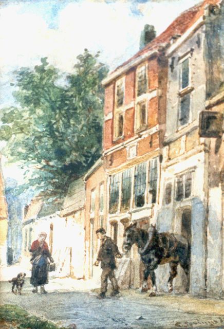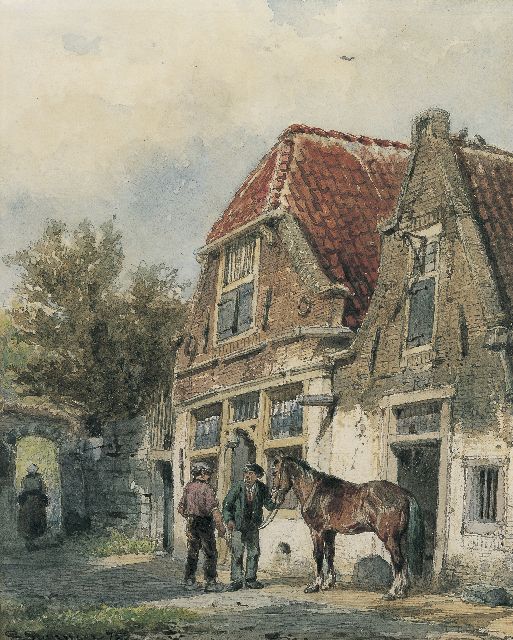 Cornelis Springer | Stalknechten met paard in een straatje, potlood en aquarel op papier, 24,6 x 19,8 cm, gesigneerd l.o. en gedateerd '75