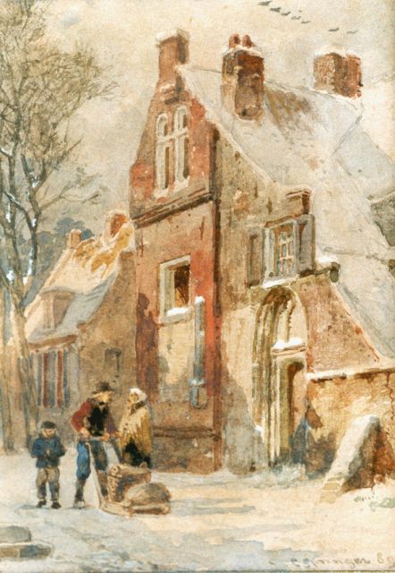 Cornelis Springer | Winters straatje te Hattem met gezelschap en duwslede, aquarel op papier, 14,5 x 11,0 cm, gesigneerd r.o. en gedateerd '89