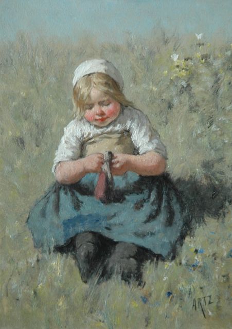 David Artz | Breiend vissersmeisje in de duinen van Katwijk  (alleen tezamen met pendant), olieverf op paneel, 22,5 x 16,3 cm, gesigneerd r.o.