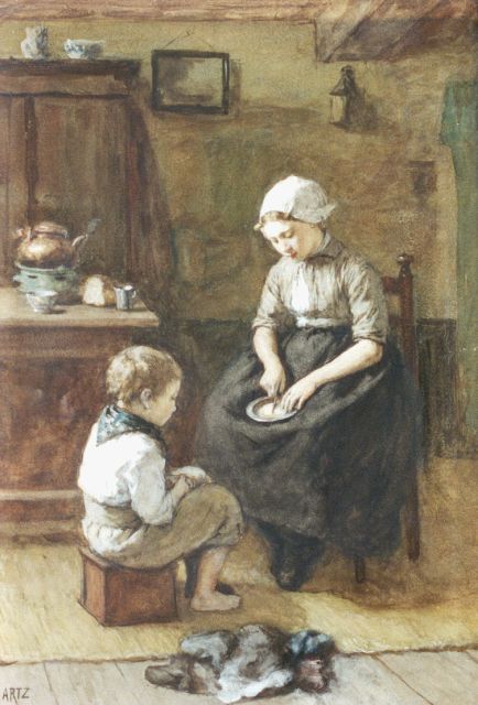 De Haagse-Schoolschilder D.A.C. Artz was in zijn tijd al beroemd om zijn prachtige, gevoelig geschilderde voorstellingen van het vissersleven in Scheveningen. In zijn keuze voor dit genre was hij sterk beïnvloed door Jozef Israëls, met wij hij als jong schilder vriendschap had gesloten. In stilistisch opzicht was hij echter niet een navolger van Israëls te noemen. Zijn manier van schilderen is minder atmosferisch, veel scherper van tekening en veel preciezer in detaillering.