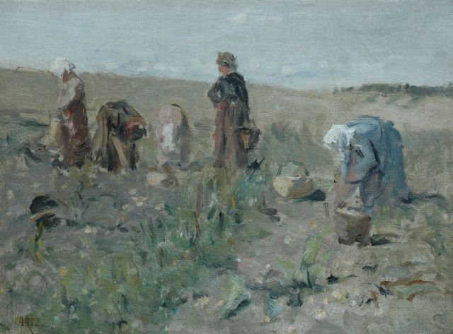 David Artz | Aardappelrooisters in de duinen, olieverf op doek op paneel, 30,9 x 41,6 cm, gesigneerd l.o.