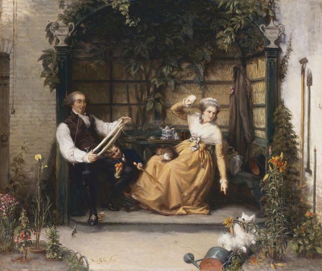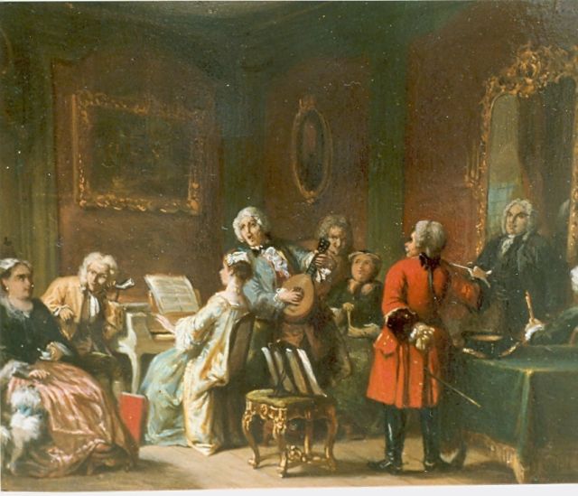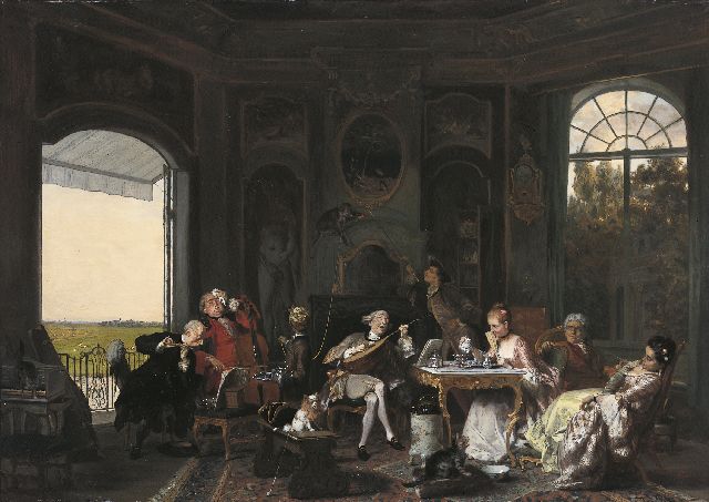 David Bles | Muziekliefhebberij op een warme dag op de buitenplaats Batavia, olieverf op paneel, 52,5 x 73,2 cm, gesigneerd r.o. en verso gedateerd september 1874