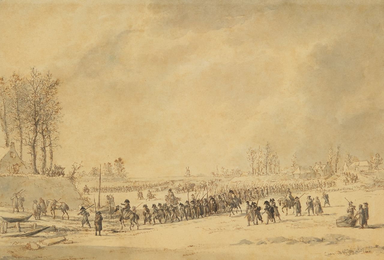 Tekenaar, schilder en etser Dirk Langendijk werd in 1748 in Rotterdam geboren. Hij tekende voornamelijk (zee)gevechten en militaire taferelen uit de tijd van de patriotten en de Napoleontische veldtocht in Nederland (vanaf 1892), die eindigde in de Bataafse Republiek. Hij was een leerling van de behang- en koetsschilder Dirck Anthonie Bisschop, maar specialiseerde zich al op jonge leeftijd in het militaire genre. De kunstenaar was bijzonder bedreven in het weergeven van grote groepen, vooral soldaten, officieren en paarden. Dit leverde hem bewondering op van tijdgenoten. Vaak werd zijn werk gekopieerd door andere kunstenaars, zoals J.A. Bemme, een leerling van Langendijk. In 1796 ontwierp de schilder het embleem voor de vlag van de marine van de Bataafse Republiek.