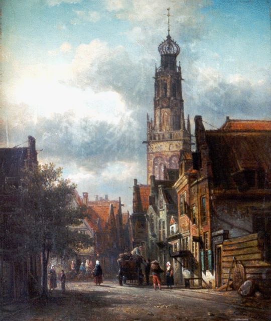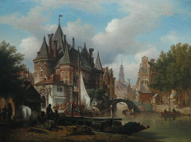 Elias Pieter van Bommel | Stadsgezicht met de Amsterdamse Waag en de Zuiderkerkstoren, olieverf op doek op board, 45,8 x 60,5 cm, gesigneerd r.v.h.m.