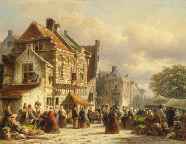 Elias Pieter van Bommel | Groentemarkt in Hollands stadje, olieverf op paneel, 27,0 x 34,9 cm, gesigneerd l.o. en gedateerd '52