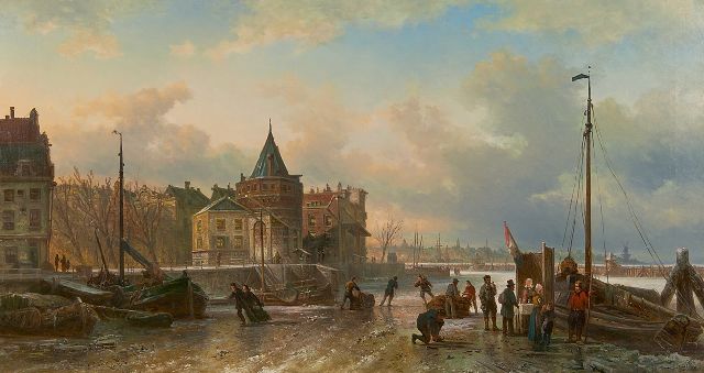 Elias Pieter van Bommel | IJsvertier bij de Schreierstoren, Amsterdam, olieverf op doek, 54,3 x 100,4 cm, gesigneerd l.o. en gedateerd 1883