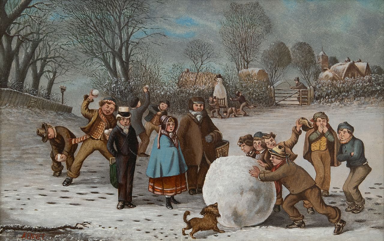 Bij het maken van dit schilderij eind 19e eeuw heeft de onbekende Engelse meester ‘Kennet’ vast gekeken naar het werk van de in die tijd bekende genreschilder William Hemsley (1817/1819-1906). Hemsley was als zoon van een architect voorbestemd zijn vader in zijn beroepskeuze te volgen, maar al vroeg bleek zijn artisitieke belangstelling en leerde hij zichzelf schilderijen in zijn vrije tijd. Uit de keuze voor de thema’s in zijn werk blijkt zijn liefde voor de dagelijkse dingen in het leven, bij voorkeur wat kinderen bezighield. 'Kennet' schilderde een winters landschap met kinderen die van het winterse sneeuwdek genieten. Een paar kinderen rollen een enorme sneeuwbal vooruit, enkelen verkneukelen zich heimelijk om de aanval met sneeuwballen die zij in petto hebben voor het ouderpaar vóór hen of blazen hun handen warm van de kou, anderen weer dansen op de achtergrond om een grote sneeuwpop. Al deze elementen vormden het recept voor een aantrekkelijke en populaire voorstelling in die tijd. En zouden dat ook nu moeten zijn, in een tijd waarin een een goed pak sneeuw, nodig voor dikke winterpret, steeds minder vaak voorkomt.