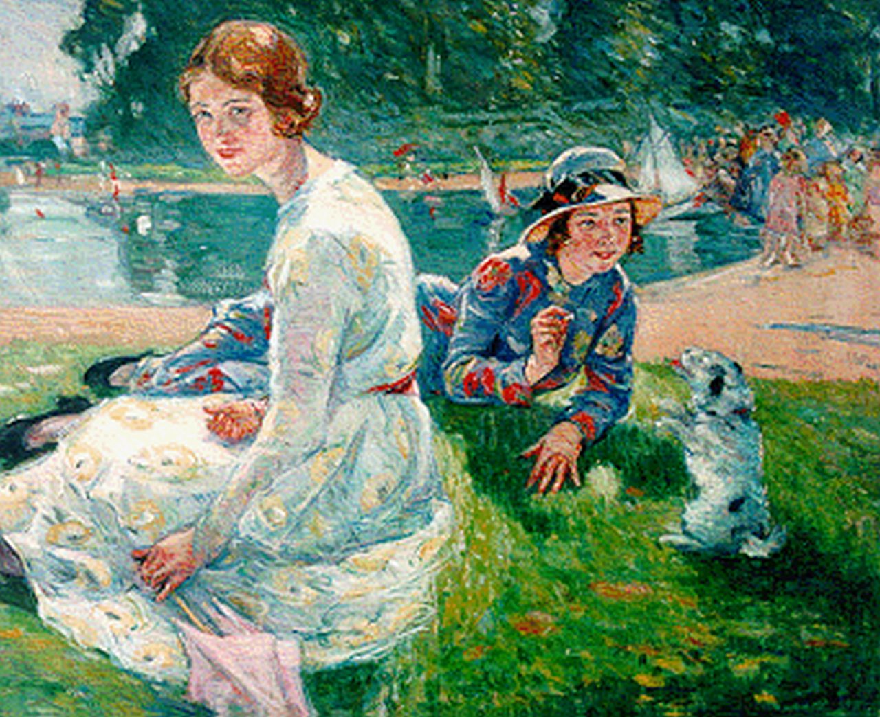 Ernest Borough Johnson | Meisjes bij de vijver in Hyde Park, olieverf op doek, 50,7 x 60,7 cm, gesigneerd r.o.