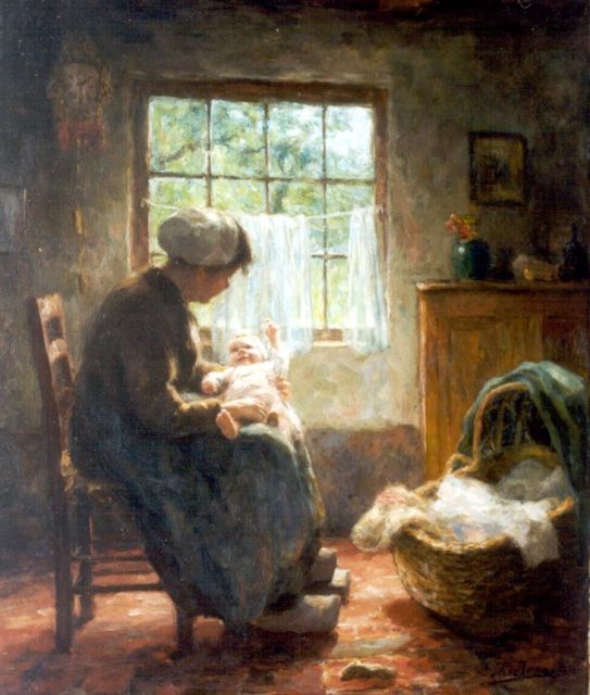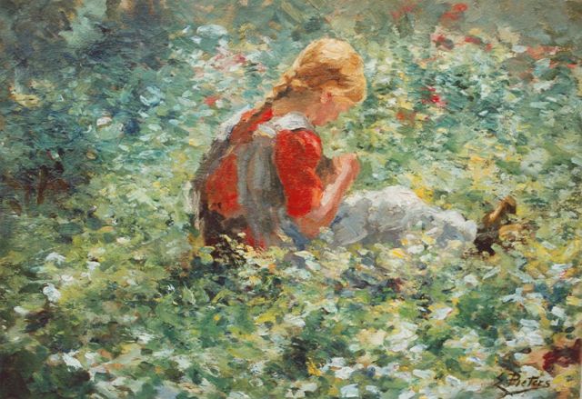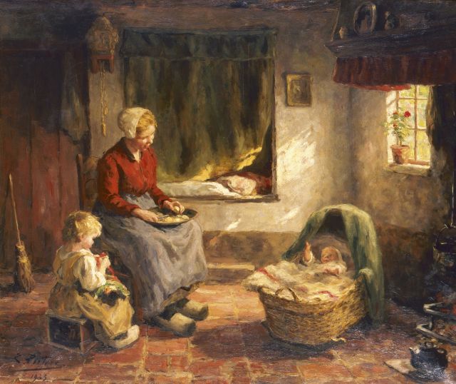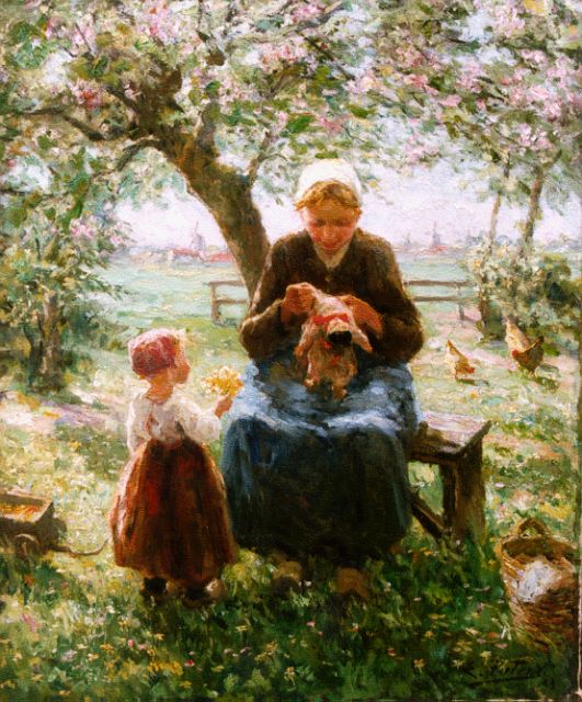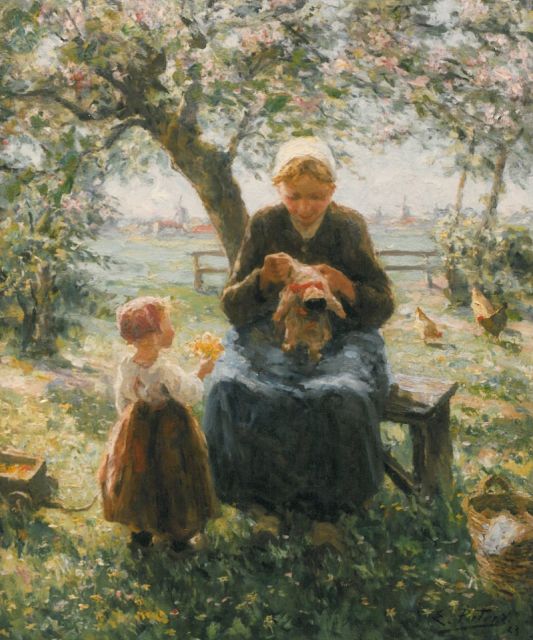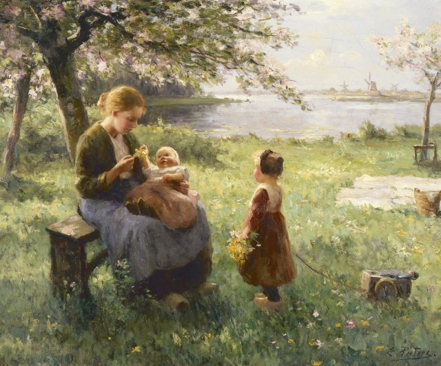 Evert Pieters, in 1856 geboren in Amsterdam, vertrok op 23-jarige leeftijd naar de Academie van Beeldende Kunsten in Antwerpen. Na een verblijf in België en Parijs vestigde hij zich in Blaricum, waar de Gooise boerenbevolking hem inspireerde tot het schilderen van zonnige boereninterieurs met moeders en spelende kinderen en tuinen in bloei. Door zijn zuidelijke, kleurige palet onderscheidt hij zich van andere Gooise schilders als Albert Neuhuys en Hein Kever. Als geen ander kon hij in zijn forse, losse toets de weerschijn schilderen van het zonlicht op blonde kinderkopjes, de vlekkerige schaduw van een bloesemboom en de felgekleurde bloemen in het gras. In deze Gooise tijd raakte de familie Pieters ook bevriend met kunstverzamelaars William en Anna Singer, die ook werk van Pieters kopen. Pieters had veel succes met zijn werk, vooral bij de Amerikanen die ons land bezochten. De schilder blonk ook uit in het schilderen van strandgezichten met garnalen- en schelpenvissers in Katwijk.