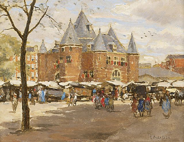 Felicien Bobeldijk | Nieuwmarkt met De Waag, Amsterdam, olieverf op paneel, 16,9 x 22,0 cm, gesigneerd r.o. en verso op etiket