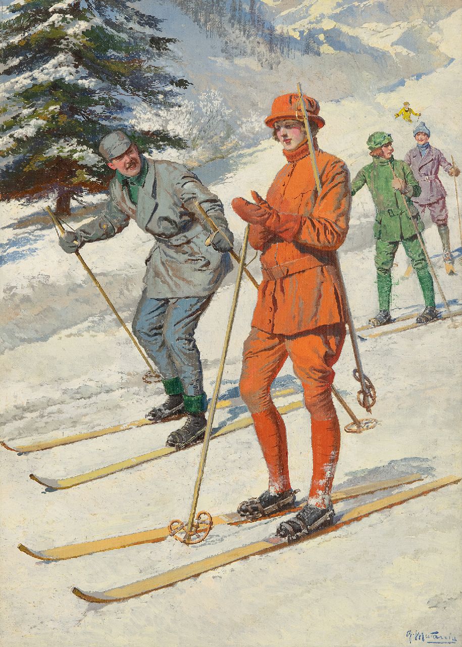 De Italiaanse kunstenaar Fortunino Matania werd wereldwijd bekend als vervaardiger van oorlogsillustraties, die hij maakte in de twee wereldoorlogen. Deze prenten verschenen in de grote internationale opiniebladen en geschiedenisboeken en waren enorm populair. Matania’s oeuvre kent ook luchtiger onderwerpen. Zo schilderde hij zomerse strandvoorstellingen, mondaine uitgaansscènes, historische taferelen, Italiaanse genrestukjes en skivoorstellingen. De schilder werd geboren in Napels en opgeleid in het atelier van zijn vader, de genreschilder Edoardo Matania. Hij studeerde in Parijs, Milaan en Londen. Gedurende de beide wereldoorlogen woonde hij in Londen. Tijdens het Interbellum schilderde hij societygebeurtenissen, waaronder de kroning van Edward VII.
