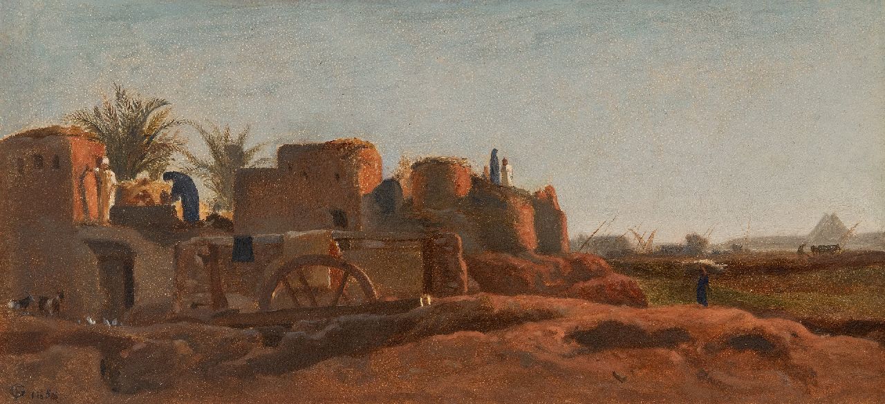 Frederick Goodall | Dorp langs de Nijl, papier op doek, 17,9 x 38,2 cm, gesigneerd met monogram en gedateerd 1858, zonder lijst
