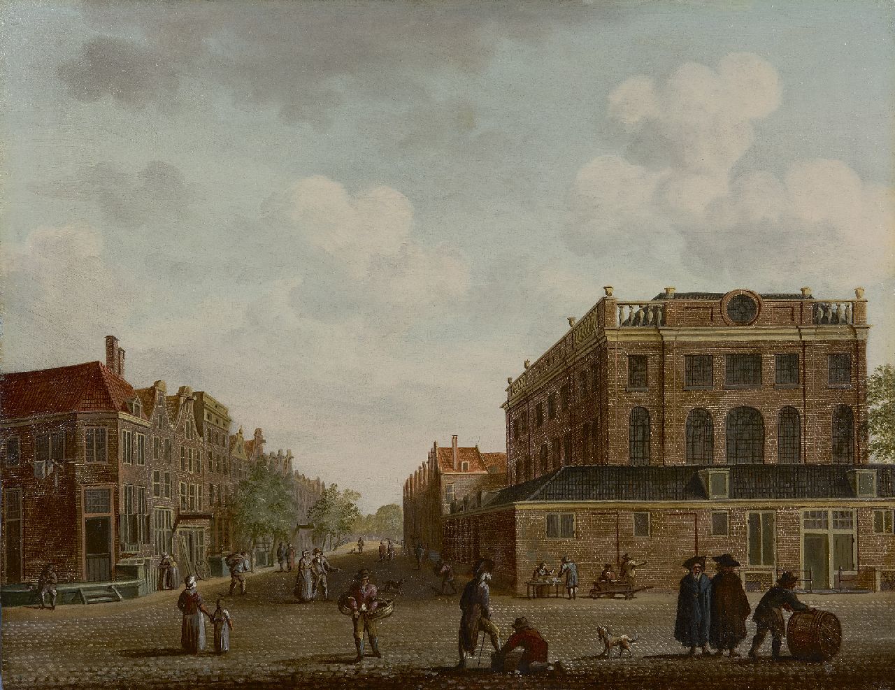 Fredericus Theodorus Renard | De Portugese Synagoge gezien vanuit de Jodenbreestraat in Amsterdam, olieverf op paneel, 33,8 x 43,8 cm, eind 18e eeuw